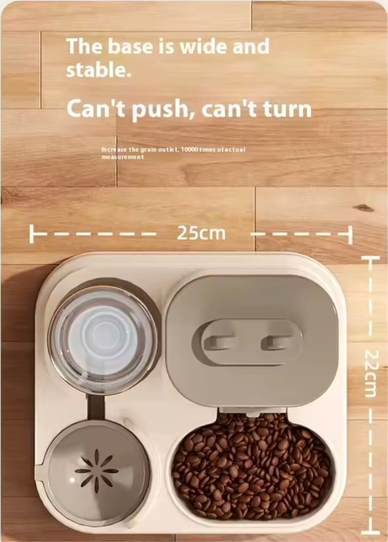 Grazie al sistema di erogazione automatica, il distributore rilascia il cibo secco in modo graduale, mentre il serbatoio laterale assicura un flusso costante di acqua pulita. Il design compatto e moderno si adatta perfettamente a qualsiasi ambiente domestico.